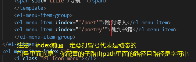 5.在配置好子路由后,就可以在導航菜單欄中使用,使用時只需對index設置需要跳轉(zhuǎn)頁面路徑就行了,如下圖: